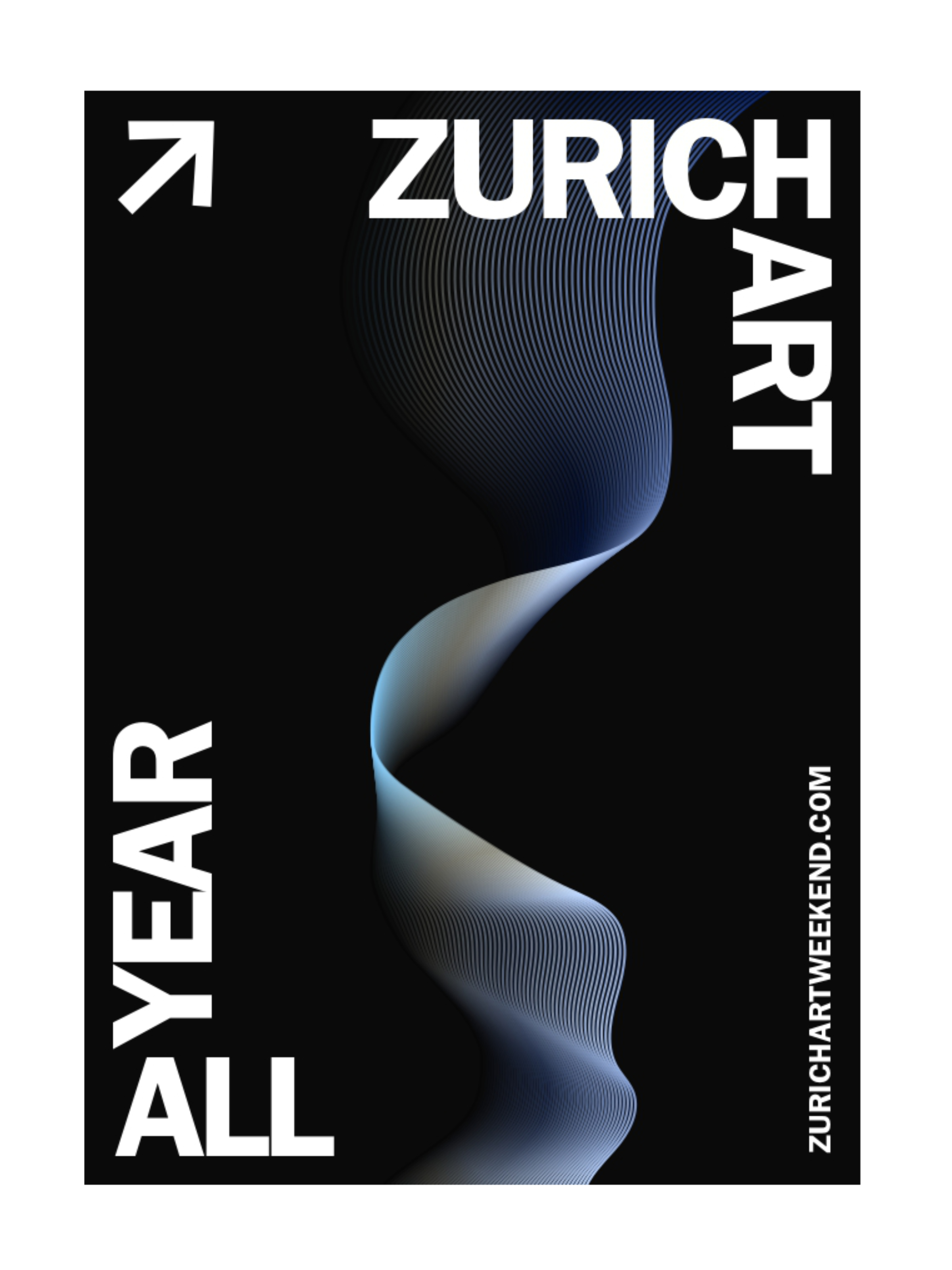 The design concept embraces a minimal black and white palette, allowing a singular flow of light to become the focal visual element. The luminous stream cuts through the darkness and embodies continuous movement, an ever evolving path that mirrors the year round artistic rhythm of Zurich Art All Year. The dynamic flow generates subtle gradients and shifts that reflect the diversity and richness of Zurich’s cultural landscape throughout the year. The overall composition remains intentionally clean and minimal, ensuring full attention is drawn to the guiding flow. On the reverse side, the “Zurich Art All Year” round text recalls a postal stamp, reinforcing the postcard as a traveling invitation.